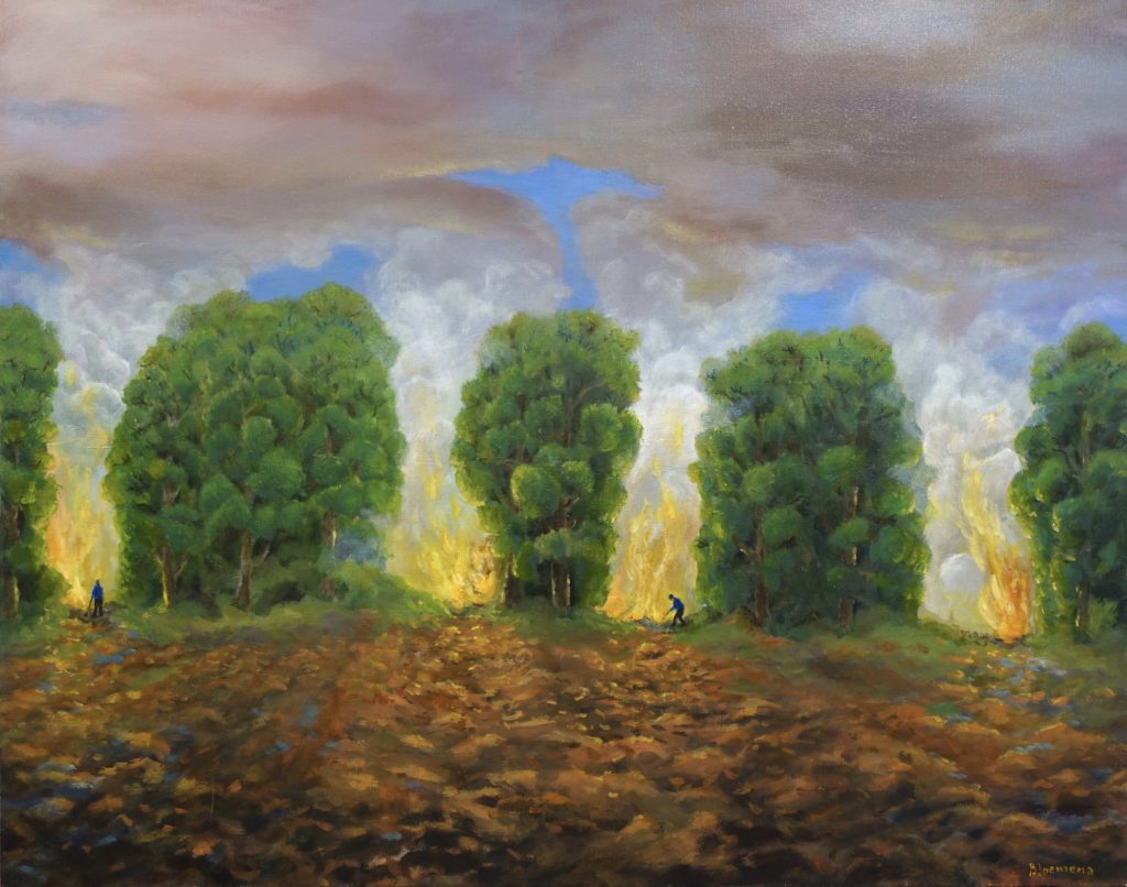De wereld van Wiebe Bloemena is er een van wonderlijke, soms spookachtige dromen. Zijn altijd zeer volle schilderijen zien er op het eerst gezicht idyllisch uit, met hun grillige bomen, wolkenpartijen, nachtelijke vijvers en, hier en daar, een schaap of hert. Toch blijkt er bij nader inzien altijd iets dreigends aan de hand, of het nu de smeulende vuren zijn die op sommige schilderijen tussen de stammen oplichten, of de bulldozers die onder je ogen bezig zijn de idylle te verpesten.